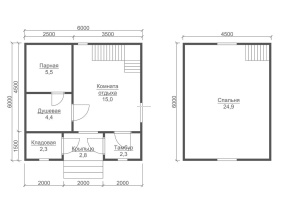 Сруб с мансардой: 1-ый этаж- 2,3 м. (17 венцов) 2-ой этаж (мансарда)- 2,3 м. Сруб в полтора и два этажа: 1-ый этаж 2,3 м. (17 венцов) 2-ой этаж 2,3 м. каркасные аттиковые стены (боковые) высотой 1,5 м. в полутораэтажной бане. 2,3 м. (поднят брусом на 17 венцов) в двухэтажной бане. |